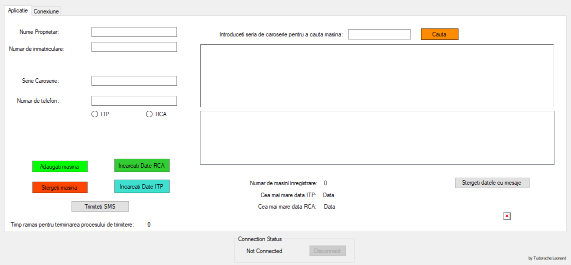 This was one of my first projects completed during my first year at Fontys University. The goal of this project was to remind people when they have to do their peridic technical inspection and the mandatory insurance for their cars. An application would be ran by an employee of a car service from where the data needed is retrieved. The application is sending text messages to the owners of the cars a week before the due date. To send text messges I made use of an USB modem connected it with a SIM card which was abel to send a message every 5 seconds. This method was used at that time because there weren't many online APIs that had the ability to send text messages.